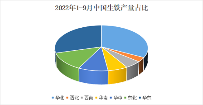 中國(guó)生鐵主要集中在華北、華東地區(qū)生產(chǎn);2022年1-9月中國(guó)生鐵產(chǎn)量大區(qū)分布不均衡,其中華北地區(qū)產(chǎn)量最高,其中河北省占比23.17%。